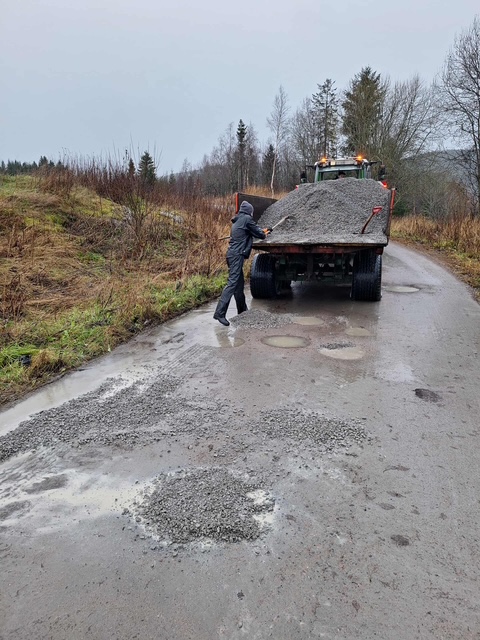 05.11.2025 I dag ble det igangsatt et omfattende vedlikehold av Fergelivegen slik som beskrevet tidligere. Hele 14 tonn med grus gikk med i hull og andre skader på vegen, helt fra start nede i bygda og opp til den gamle Tverrelv-brua. Det er nå snakk om skraping/høvling før brøytestikker settes opp.